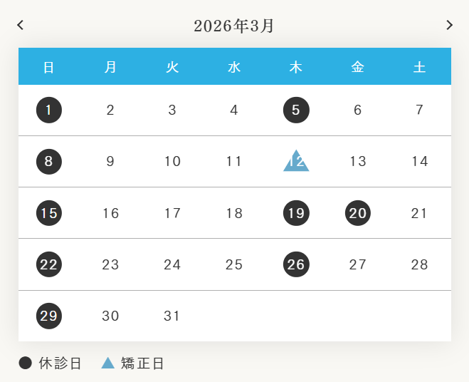【休診日】木・日・祝 【備考】第2木曜日の午後に矯正を行っています。 お電話でのご予約をお待ちしております。